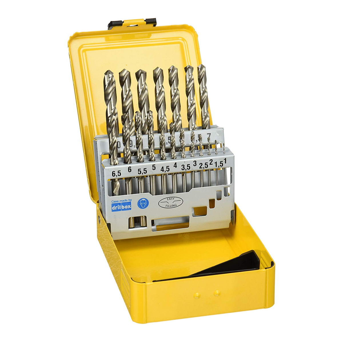 - 19dílná Sada vrtáků do kovu HSS-G DeWALT DT5923 uložené v kovové schránce.